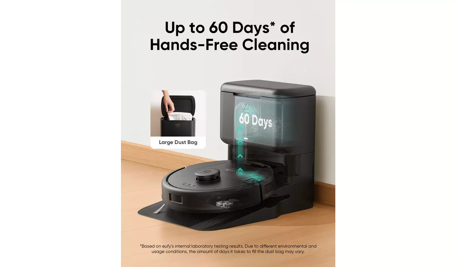 Experience a new level of clean with the Eufy L60 Hybrid SES, engineered to make your life easier. Boasting an incredible 5,000Pa of ultra-strong suction, this robotic marvel effortlessly banishes hair, crumbs, and dust from both carpets and hard floors. Forget frequent emptying – after every cleaning session, the L60 Hybrid seamlessly returns to its Self-Empty Station. Here, debris is automatically transferred to a spacious 2.5L dust bag, holding up to 60 days of dirt, meaning you only need to replace it twice a year!