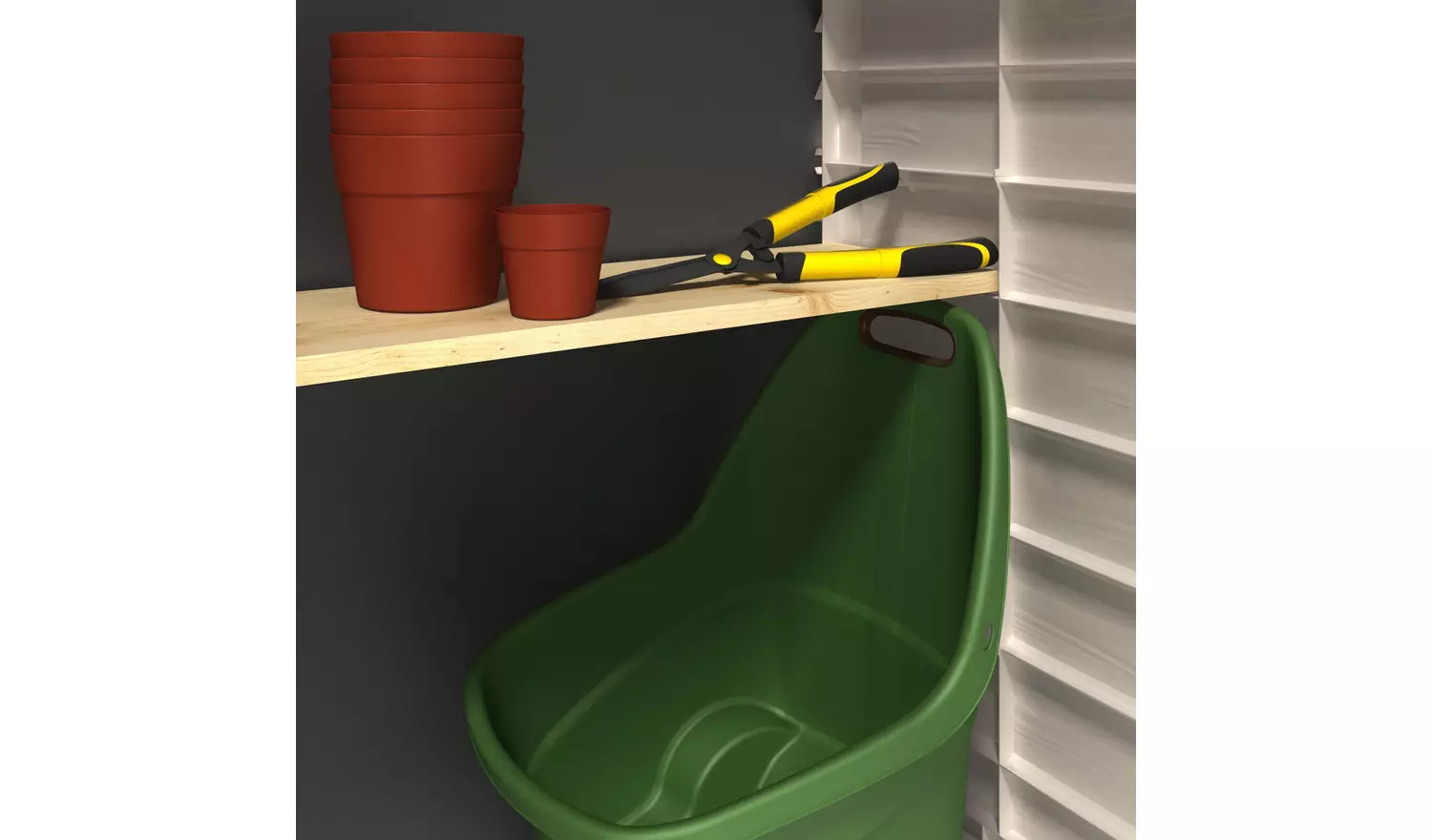 - Accommodates bikes, garden tools, or wheelie bins